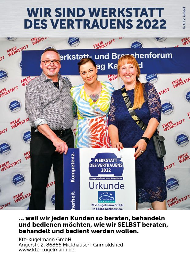 Zum 15ten Mal in Folge wurden wir auch 2022 zur "Werkstatt des Vertrauens" ausgewählt! Gütesiegel für den Kfz-Betrieb Kugelmann "Meiner Werkstatt kann ich vertrauen" - unter diesem Motto startete zum 15ten Mal der Bundeswettbewerb für rund 18.000 inhabergeführte Markenwerkstätten in Deutschland.